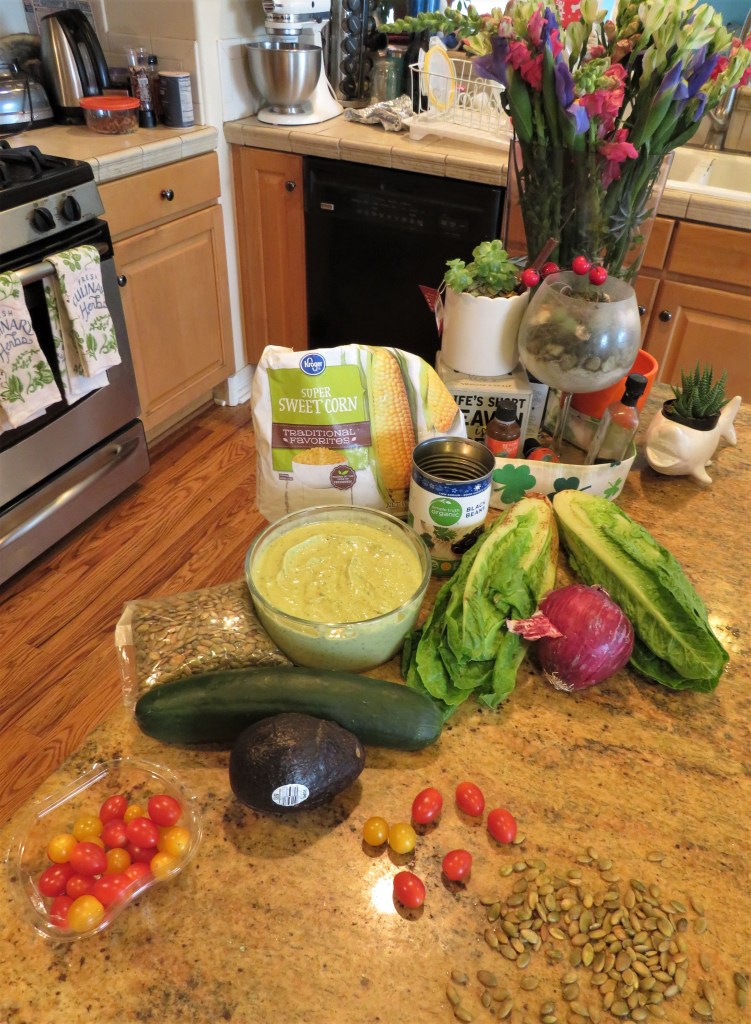 I think by now you all know about my love affair with good Mexican food. !Me gusto! So I am always looking for new recipes and new ideas to add to my ever growing repertoire. The other day when I made my enchiladas with mole sauce Enchiladas Con Pollo yΒ Mole I also made a Mexican salad with a creamy avocado dressing to go with it. I took both dishes to our potluck party and both were loved by all.