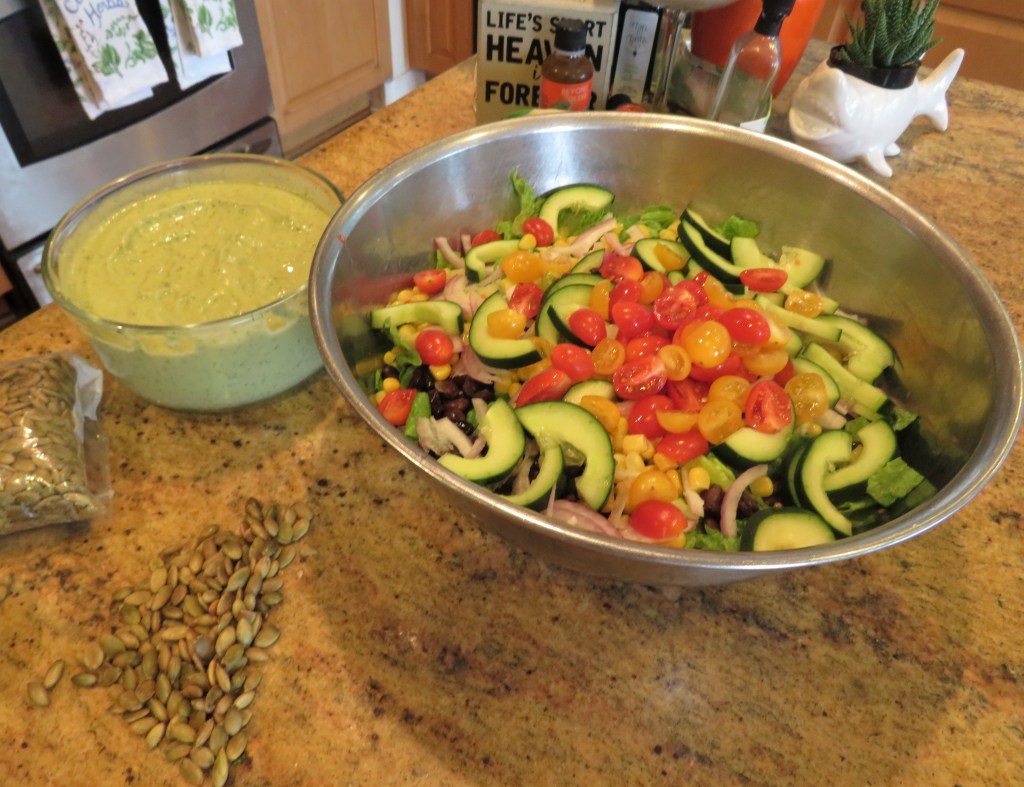 The dressing was a recipe I saw, once again, from our very own “My Meals Are On Wheels” at https://beatcancer2010.wordpress.com/. But of course, I added my own personal touches to it, as I always do.