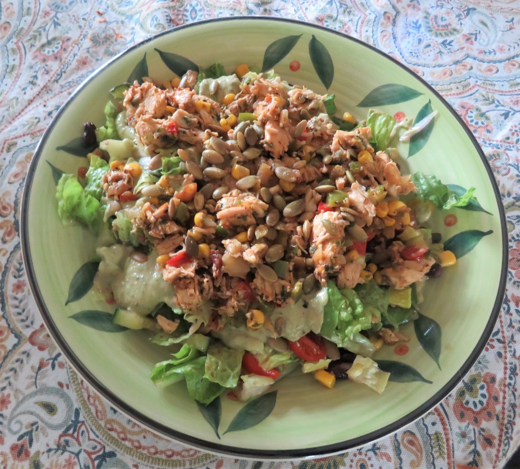 I used this salad two different ways. The first day I used it as a side salad. But I had quite a bit of my chicken filling leftover from the enchiladas, so I made the salad into a dinner salad by topping it with the chicken. Both ways, it was muy delicioso.