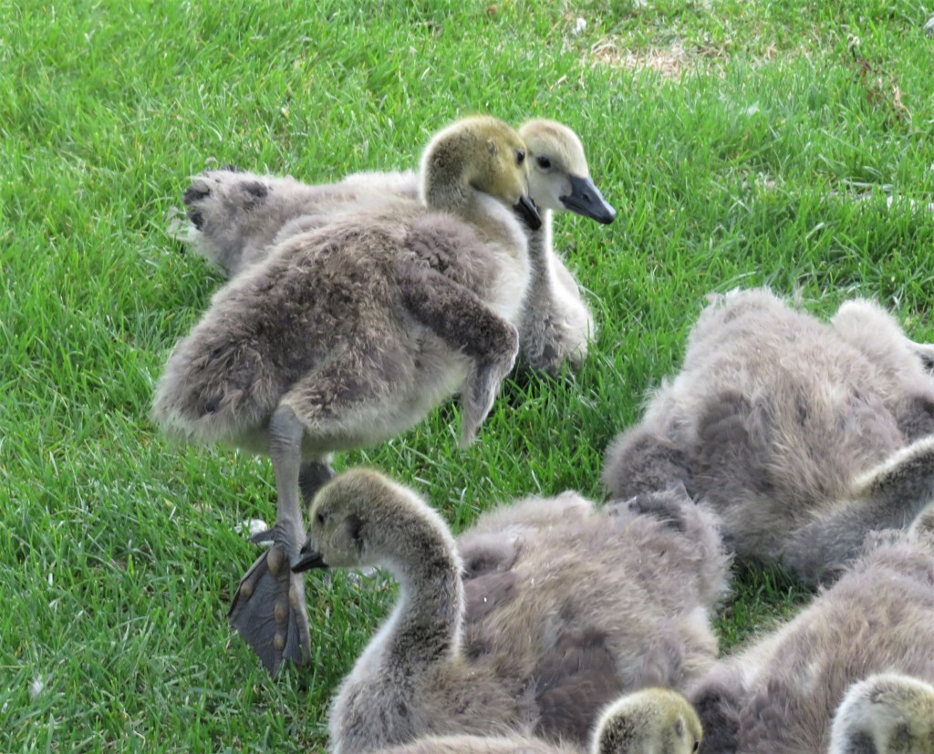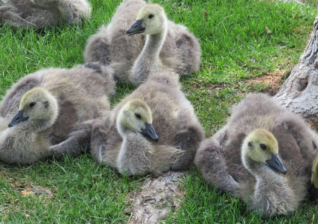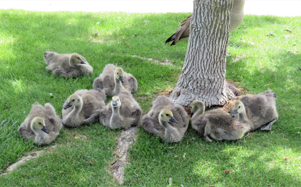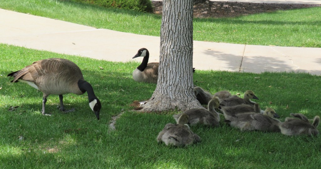 I saw my goslings again today. Boy, they sure are getting big, and so fast too. The whole family was catching a bit of shade, just relaxing under the tree.