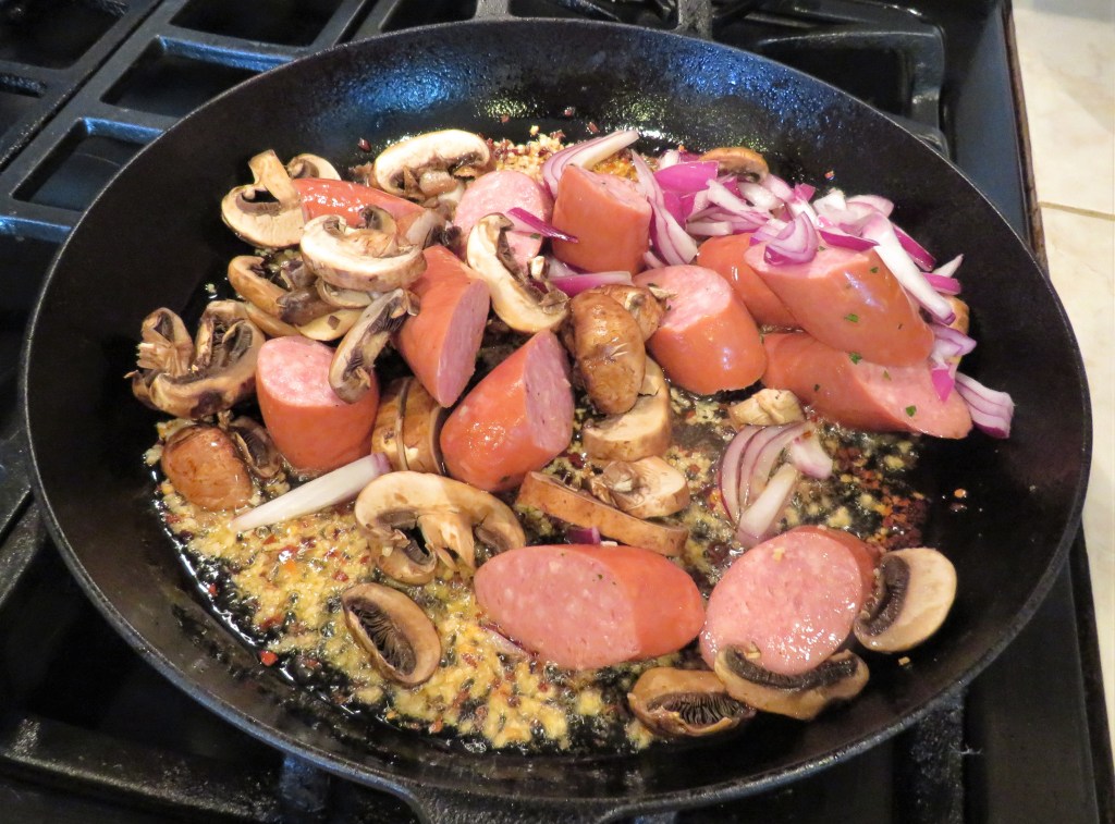Then add the sausage, mushrooms and onions. Cook for about 5-7 minutes, stirring frequently.