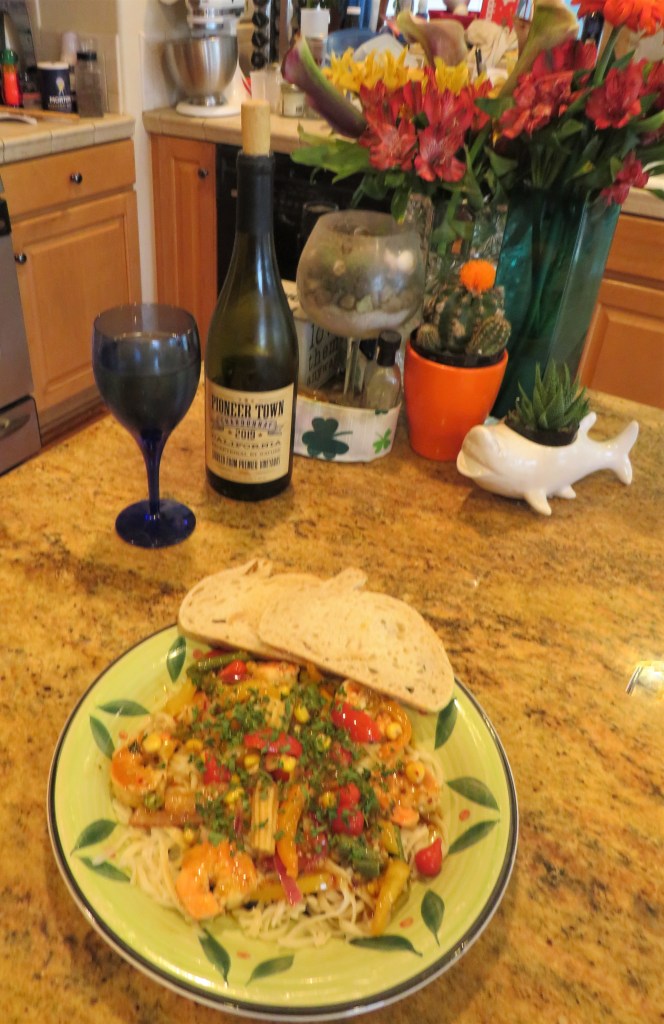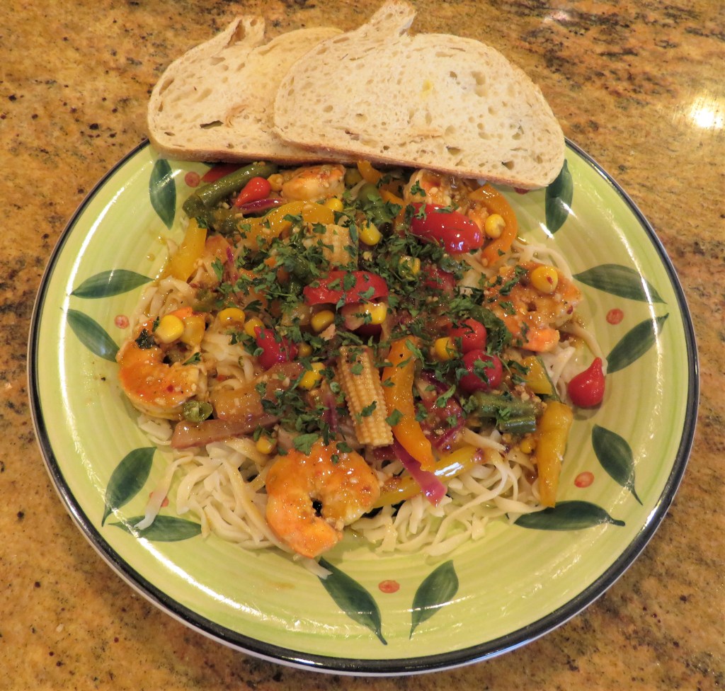 When everything is cooked and the vegetables are tender, serve over cooked noodles or pasta and enjoy with a cool, refreshing white wine of your choice. I also added some warmed bread on the side to complete the meal. This dish is loaded with colorful vegetables and is full of flavor. You could also used chicken too, if you prefer it, either with or with out the shrimp.