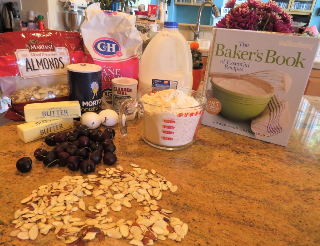 Combine the flour, salt, baking powder and cold butter together and mix until it resembles coarse sand. Add the cherries and gently fold in.