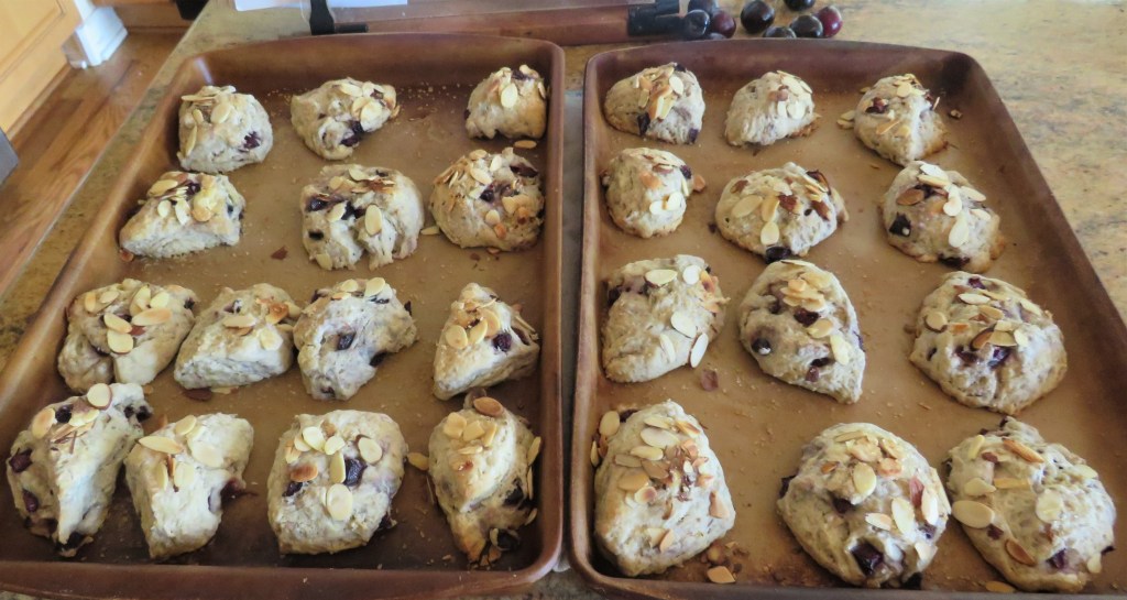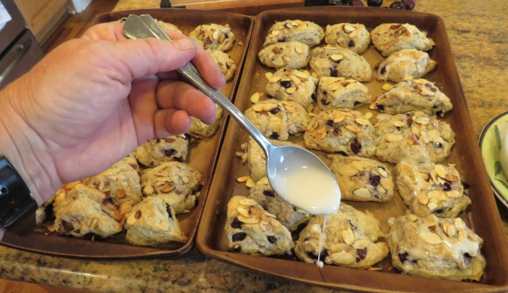 Sprinkle a few slivered almonds on top of each scone and then add a little turbinado sugar to help with the browning. Bake for about 25 minutes or until just lightly browned around the edges. Remove and let cool completely before adding the glaze if you are going to.