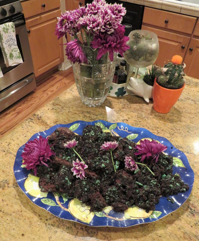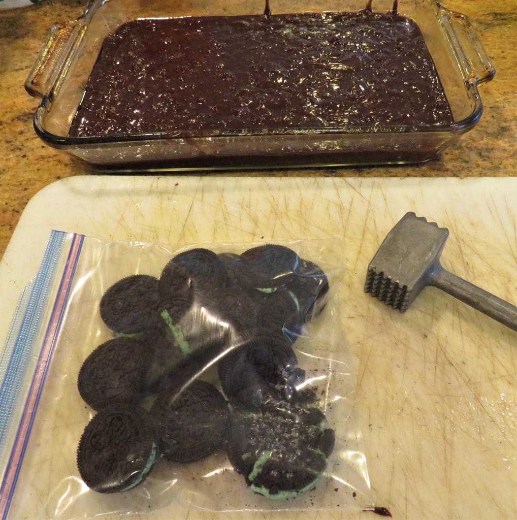 I placed a whole bunch of mint cookies in a plastic bag and hit them with my meat tenderizer to crumble them up.