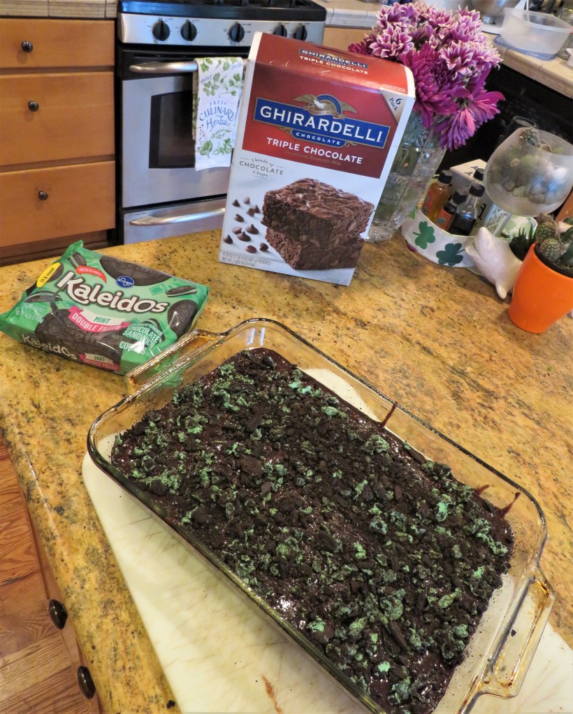 I started off with a the brownie mix and followed the directions for those, but also added a little mint extract to the mix, 2 tsp, and then some crumbled mint Oreo-styled cookies on top. That was it. Nothing fancy today, but definitely still very tasty.