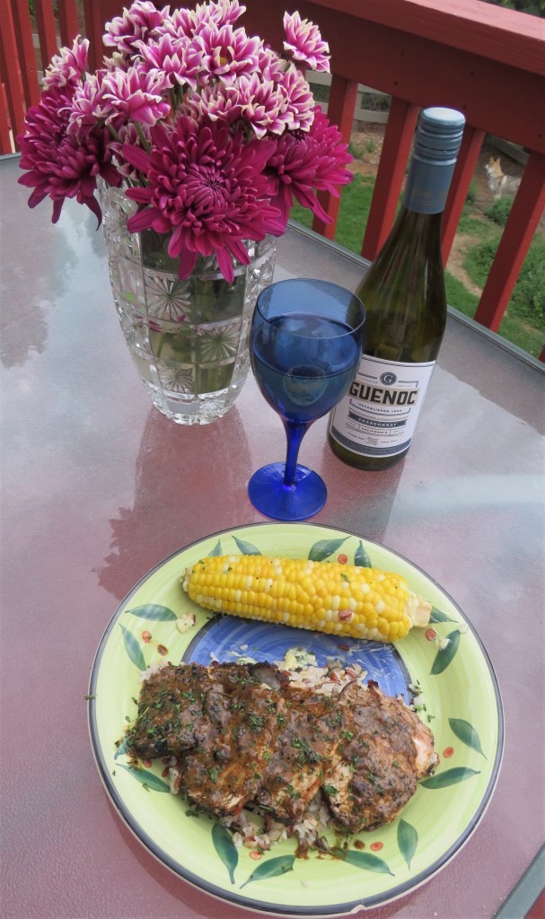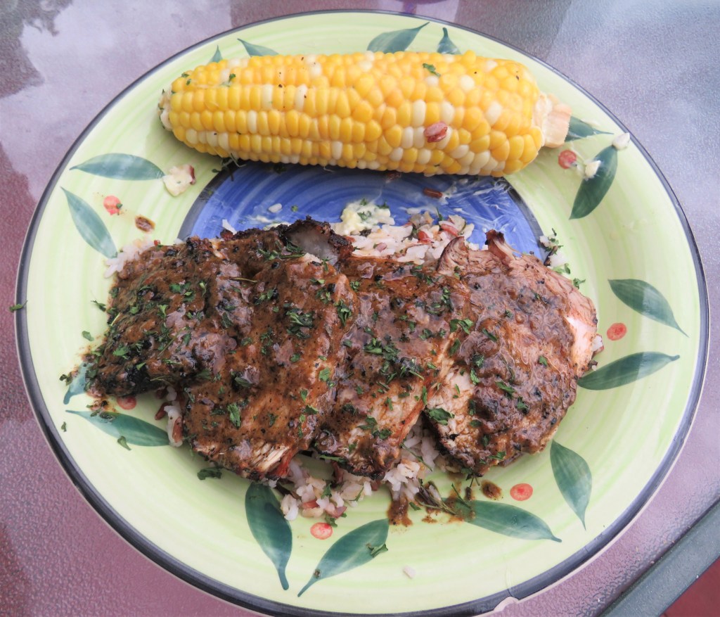 When the pork loin was ready, I added it to a bed of cooked wild rice and then topped it with my special sauce. I added some corn on the cob on the side, and a delicious buttery chardonnay and we had a scrumptious Creole dinner in no time. This meal was created in true Cajun/Creole form; nothing fancy and little bits of this and that, and that is what makes it so fun and delicious.
