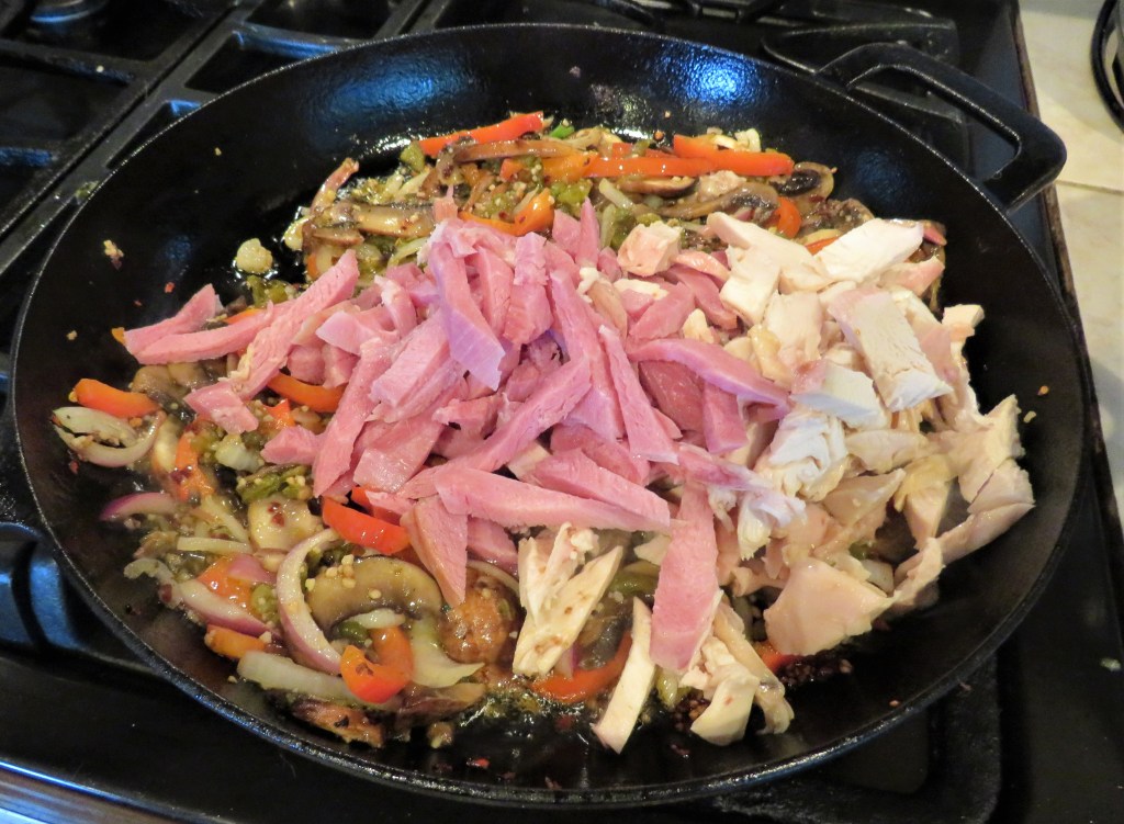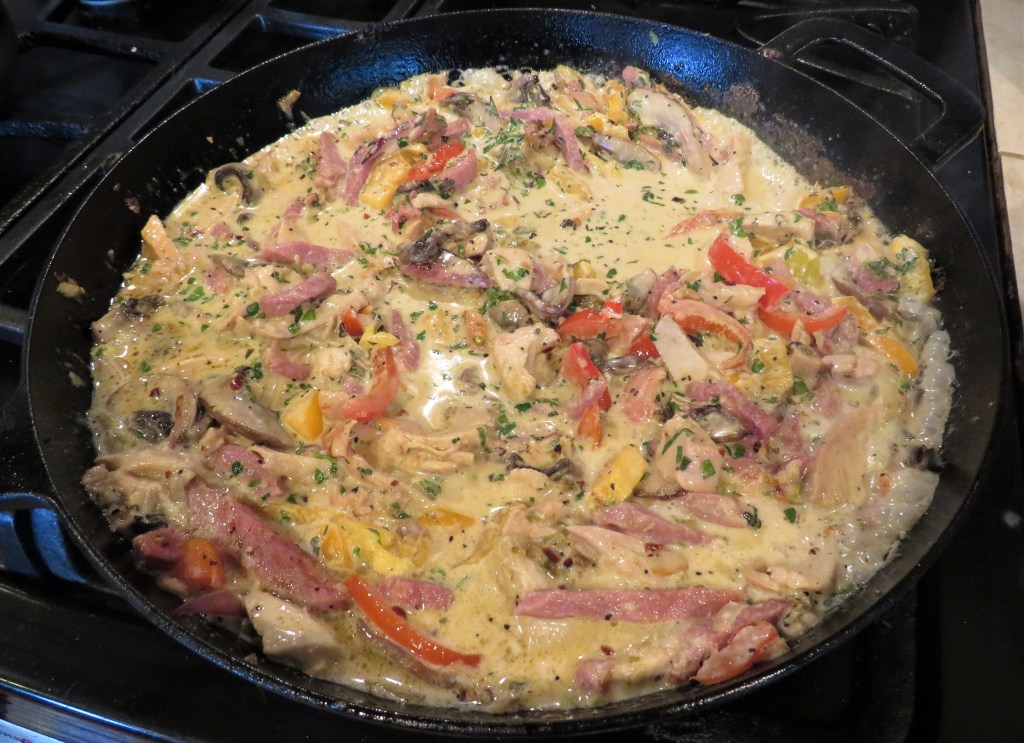 Add the chicken and ham and mix everything together. Then add the cream. Bring to a boil then reduce the heat to a simmer and continue to cook for about 5-7 minutes, once again, stirring frequently.