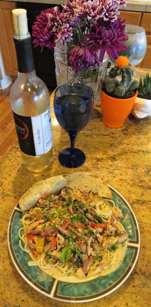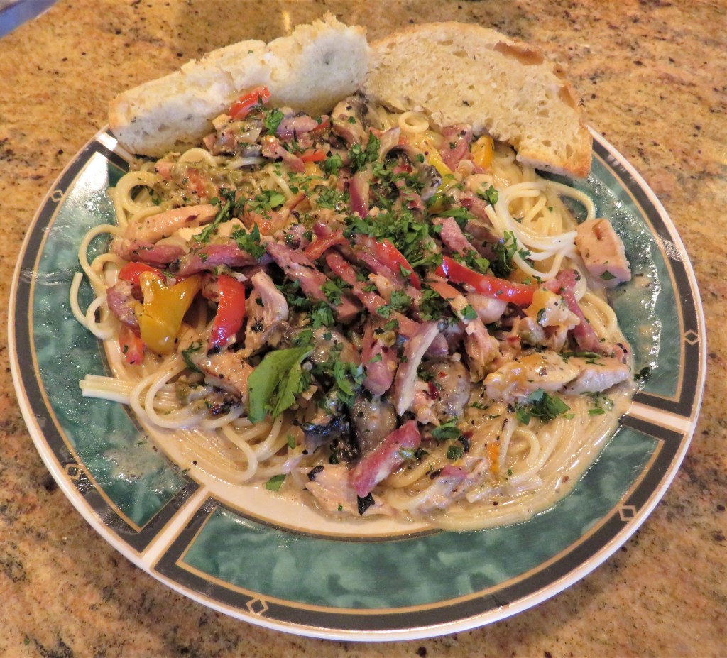 Once everything is ready, serve it over some cooked pasta. I used spaghetti, but any kind of pasta will work just fine. Add some warmed bread and a glass or two of a cool, crisp white wine, and enjoy. If you don’t like ham, just use chicken. Or vice versa. You could also add shrimp and or crab too. This is a very versatile sauce that will lend itself to just about any kind of protein, although, I don’t think beef would be the best choice. Play with it and make it yours. Use what you like best.