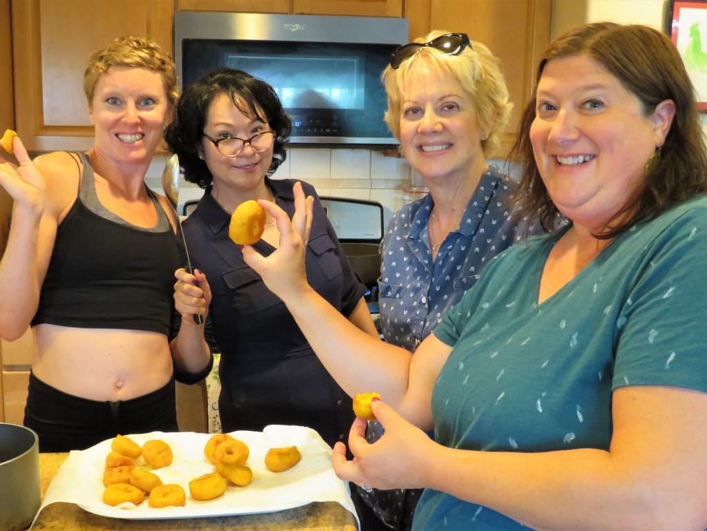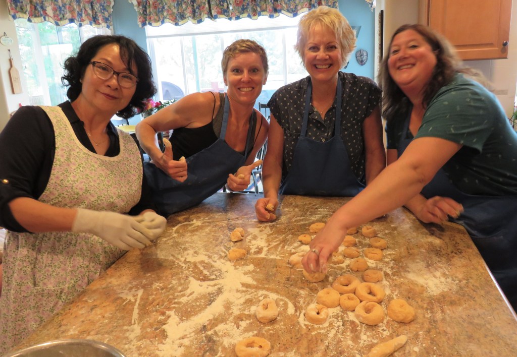 Su, Elizabeth, Peggy and Amy are starting to work on the donut making process.