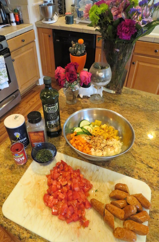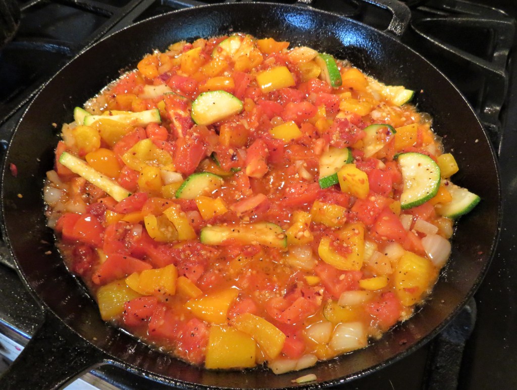 In the same skillet, add the onions, peppers, zucchini, garlic, and red pepper flakes. Cook until the vegetables are mostly done, or about 5-7 minutes, stirring frequently.