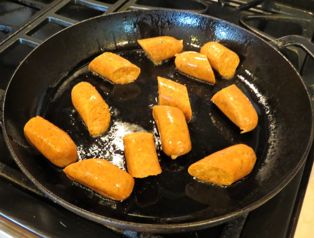 Get the skillet and oil very hot, then carefully add the sausage and brown completely. Once the sausage is browned, remove it from the heat and set it aside.