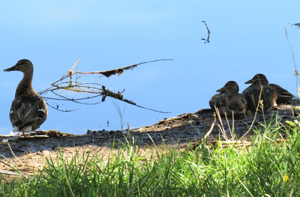 Believe it or not, we still have some young ducks around, though they are now teenagers, not babies, and will soon be old enough to fly the coup. But teenagers will be teenagers no matter what, and all moms need a break from the rambunctious brood sometimes. Momma Mallard was no exception. At first, she and her brood were all resting peacefully by the shore.