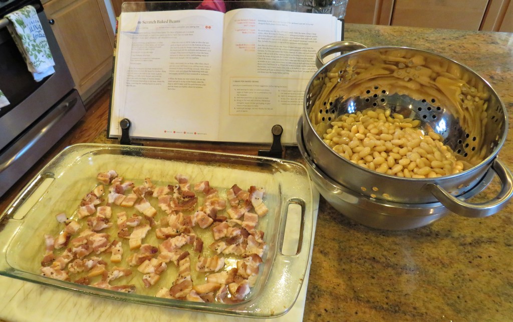Layer the bottom of the baking dish with the diced bacon, then add the beans on top of the bacon.