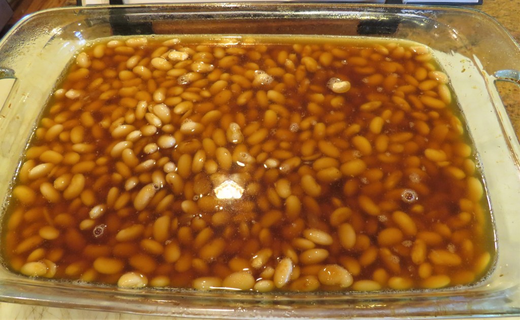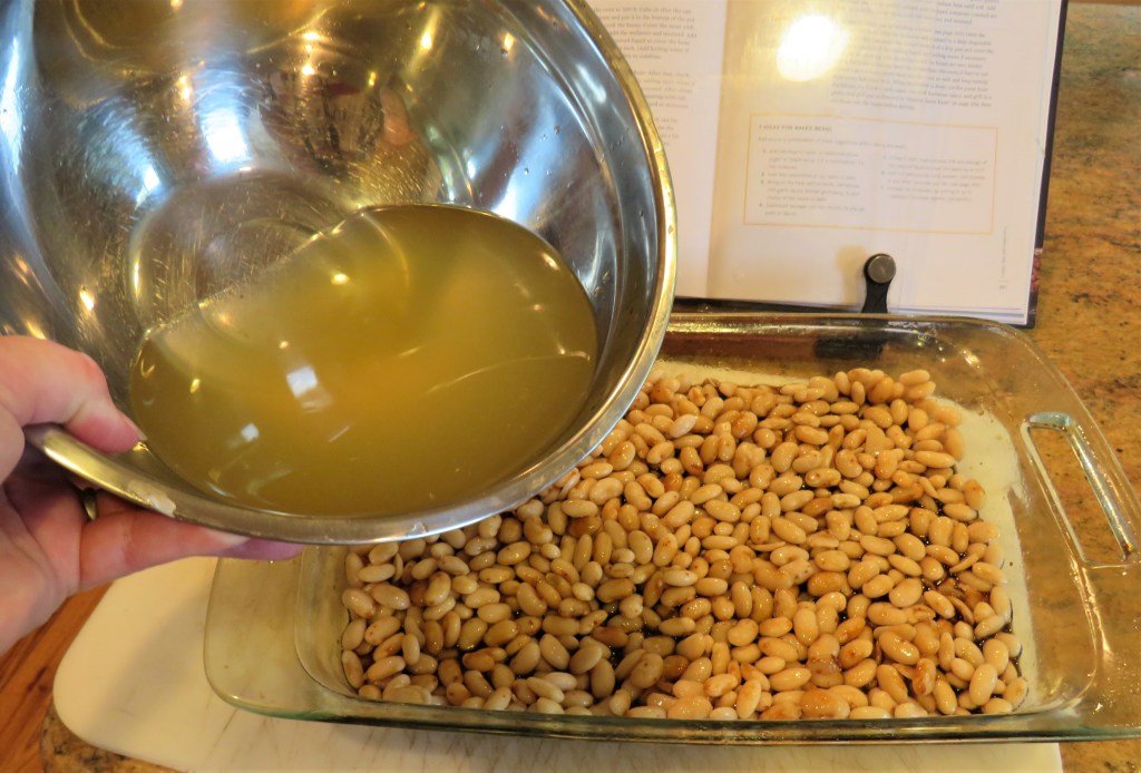 Pour the remaining reserved water over the beans, adding more boiling water if necessary. You need enough liquid to cover the beans completely. Gently stir everything together without upsetting the beans.