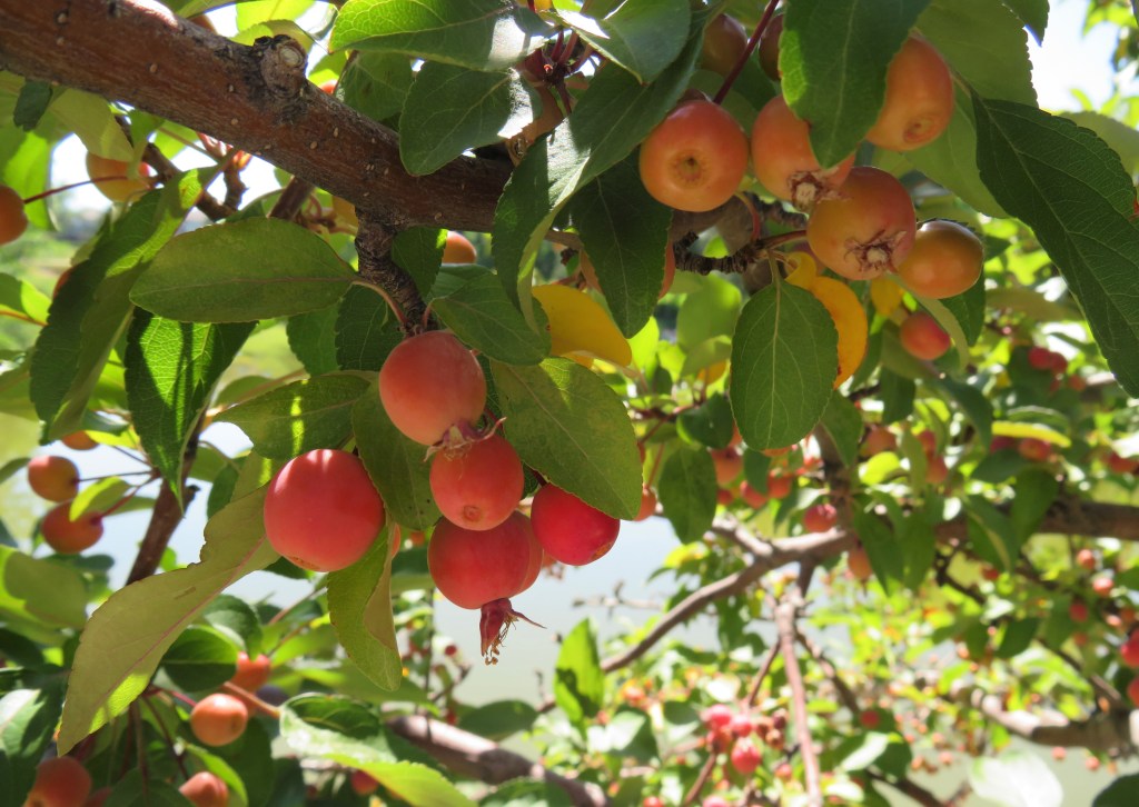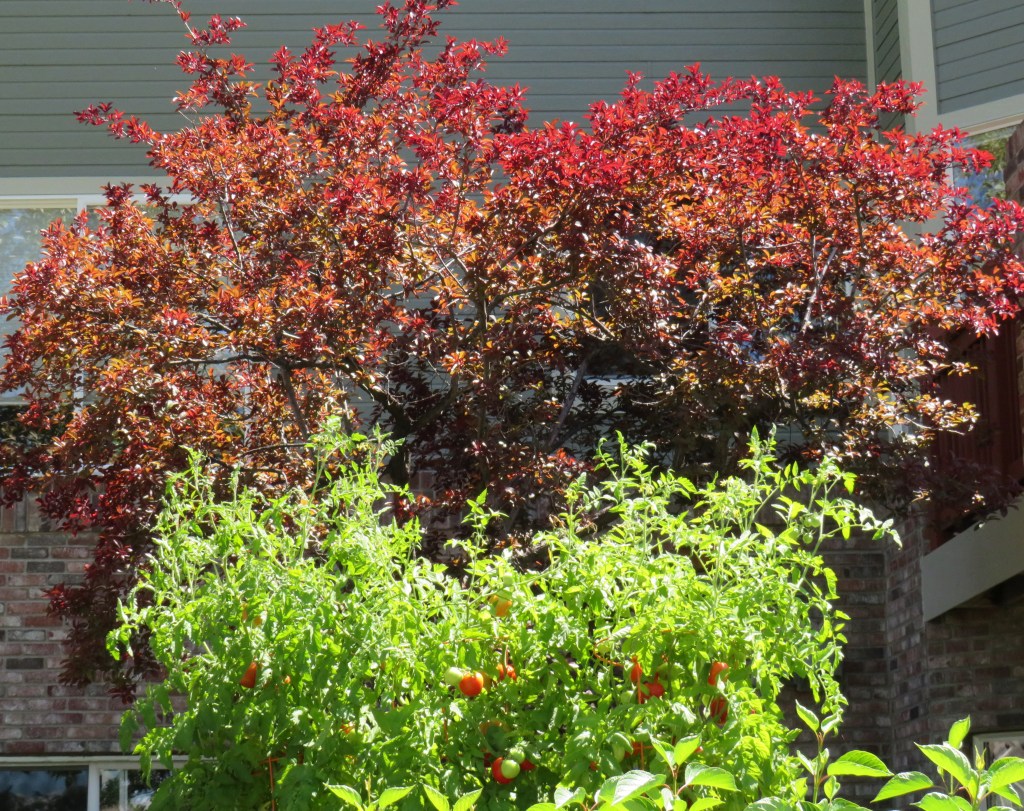 I just love this color contrast. Down below is my neighbor’s tomato plant that is in full bloom, with lots of fresh ripe tomatoes. Behind the tomato plant is a colorful tree displaying its beautiful fall colors.