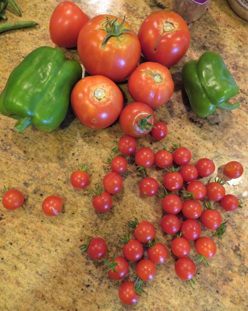 My green bell peppers and tomatoes were a delicious gift from Janet and Bob’s own garden. Bob picked them straight out of the garden and then I went home and put them to good use.