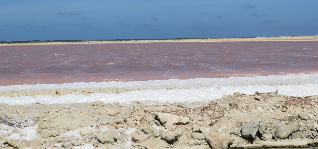 The salt mines are a beautiful pink shade, which is a stark contrast to the vivid blue/turquoise waters just across the road. They also have a beautiful foam layer on top. When the sun hits at the right angle, it looks like a sea of beautifully colored crystals, also known as sun gems. The salt produced in Bonaire is in crystal form rather than rock form, which is created by a special brine.