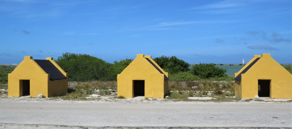 Salt mining is very hard work and is very labor intensive. Originally the salt in Bonaire was mined by the slaves who were brought over from Africa, but that ended in 1863, when the Dutch outlawed slavery. The slaves lived in these tiny little huts by the sea. These little huts housed 2-6 people. They are so tiny that a normal sized adult cannot even stand up in them. Larry is 6’4″ and he had to get on his knees to get inside.