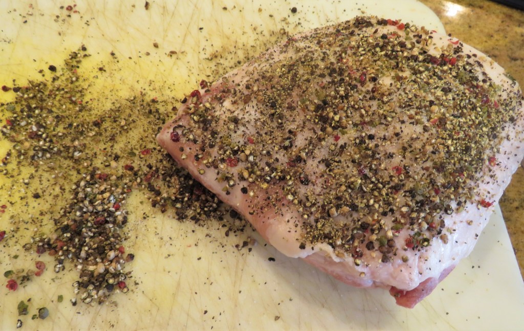 So for the pork, pat it dry with a paper towel, then press it into the crushed peppercorns. they will stick. Make the sauce in the same pan once you have transferred the pork to a baking dish. You want all he flavors and “crust” from the pork and the peppercorns. If you have a stove fan, turn that on and it should help, otherwise maybe open a window or turn on a fan close by. A lot of it is just trial and error and seeing what works best for you. If you have a grill outside, you can place it on a very hot grill or gridle and sear it for 3 minutes per side on that too, then transfer it to the oven.