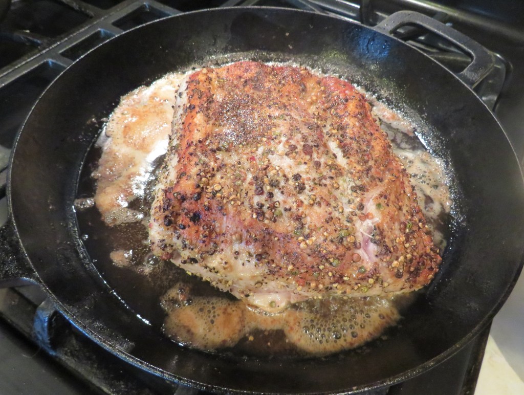 I started off by making a crushed peppercorn crust for my pork loin, then seared it for 3 minutes per side until it had a nice, golden crust all around.