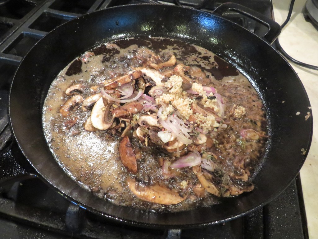 For the sauce, add about 1/4 cup of brandy and a dash more of the balsamic vinegar to the skillet, to deglaze it. Reduce the liquid to about half, then then add about 1-1/2 cups sliced mushrooms, 1 shallot, sliced very thin and about 1 TBSP of garlic and salt & pepper to taste, though you will still have some pepper from left from searing the pork loin, and cook for about 5-7 minutes, or until the onions and mushrooms are cooked.
