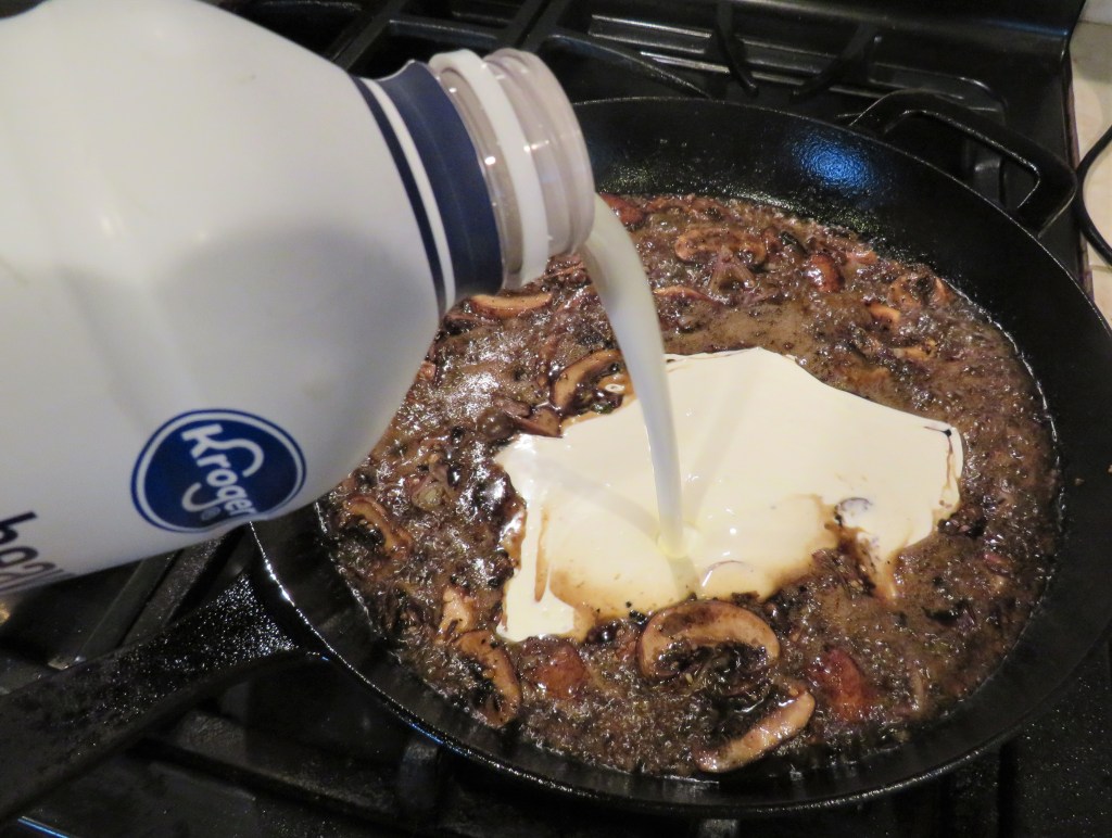 Add about 3/4-1 cup of heavy whipping cream to the mix and combine thoroughly. Bring to a boil, then reduce the heat to a simmer and continue to cook for about 7-10 minutes, stirring often.