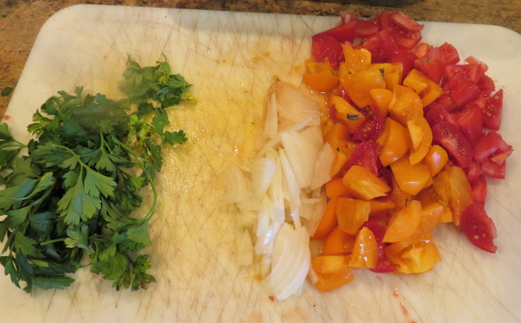 My last creation was a simple tomato salad that got used in not one, not two, but three different and delicious ways. My first creation was just a simple tomato, onion and garlic salad that is great all on its own.
