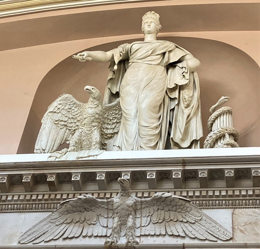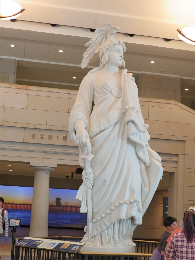 This statue represents Lady Liberty. An American eagle stands to Liberty’s right, and the scroll in her right hand is the Constitution of the United States. To her left, a serpent, the symbol of wisdom, is entwined around a section of a column.