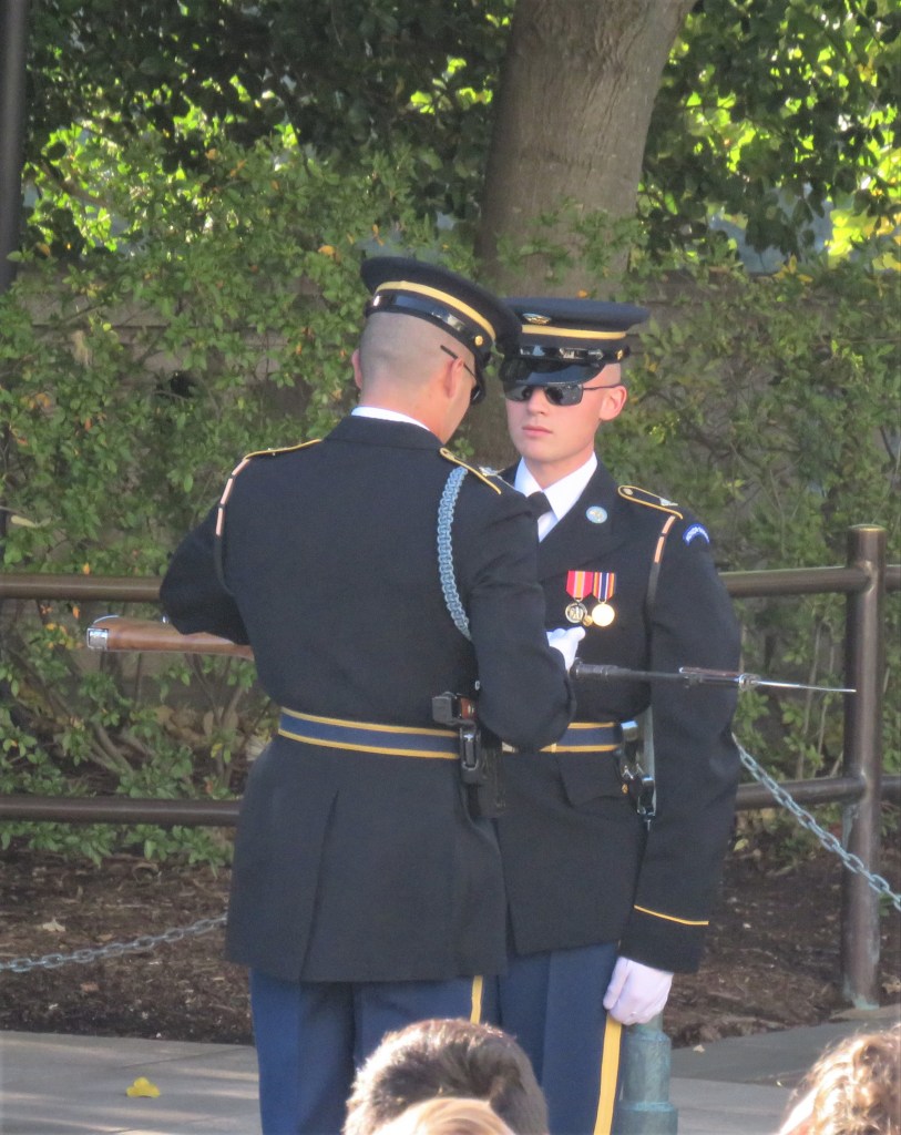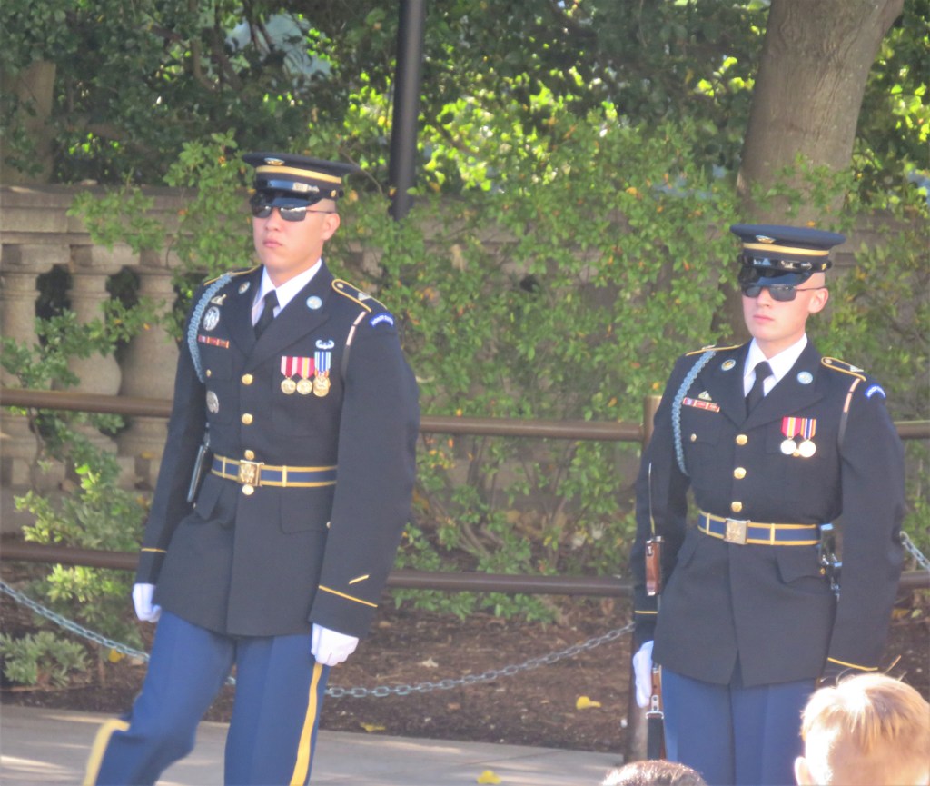 Since November 11, 1921, the Tomb has provided a final resting place for one of America’s unidentified World War I service members, and Unknowns from later wars were added in 1958 and 1984. Tomb Guards are volunteers – part of the 3rd U.S. Infantry Regiment, also known as “The Old Guard.” It is the oldest active-duty infantry unit in the Army, serving the US since 1784. The Tomb Guard marches exactly 21 steps down the black mat behind the Tomb, turns, faces east for 21 seconds, turns and faces north for 21 seconds, then takes 21 steps down the mat and repeats the process. (The number 21 symbolizes the highest military honor that can be bestowed, the 21-gun salute.)