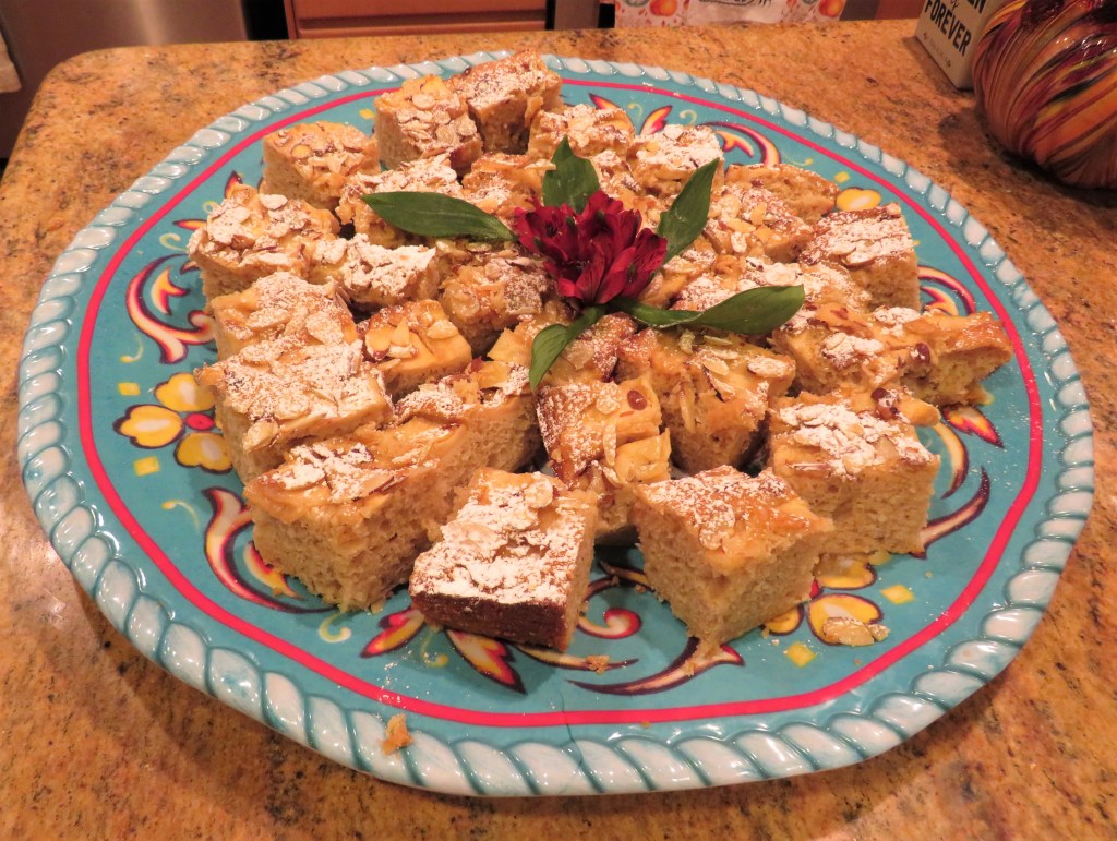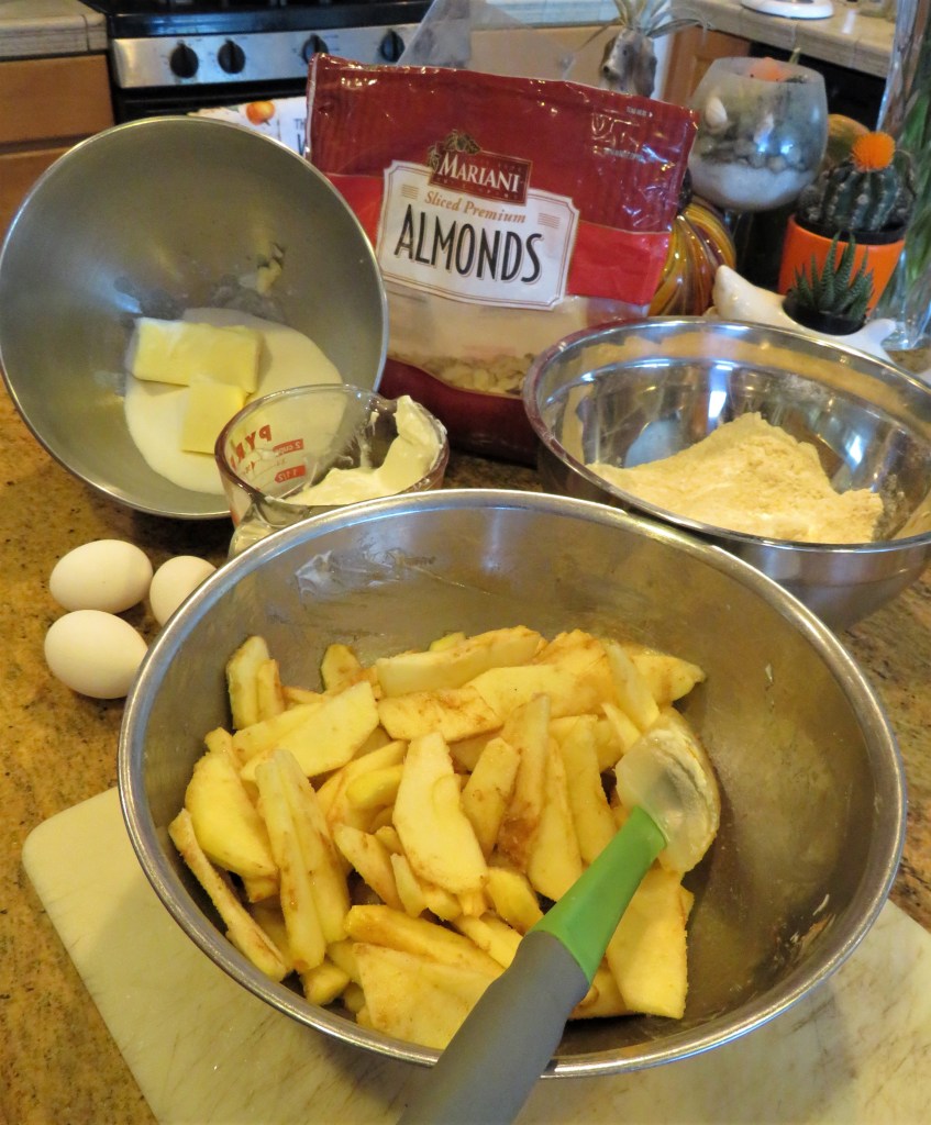 Once the apples were cooked with butter, sugar and cinnamon, I lined the bottom of my greased 9×13 baking pan with about 1/2 of the deliciously softened apples. Then I added the cake batter on top. Another layer of apples and a final layer of almond slivers went on top before putting it in the oven.