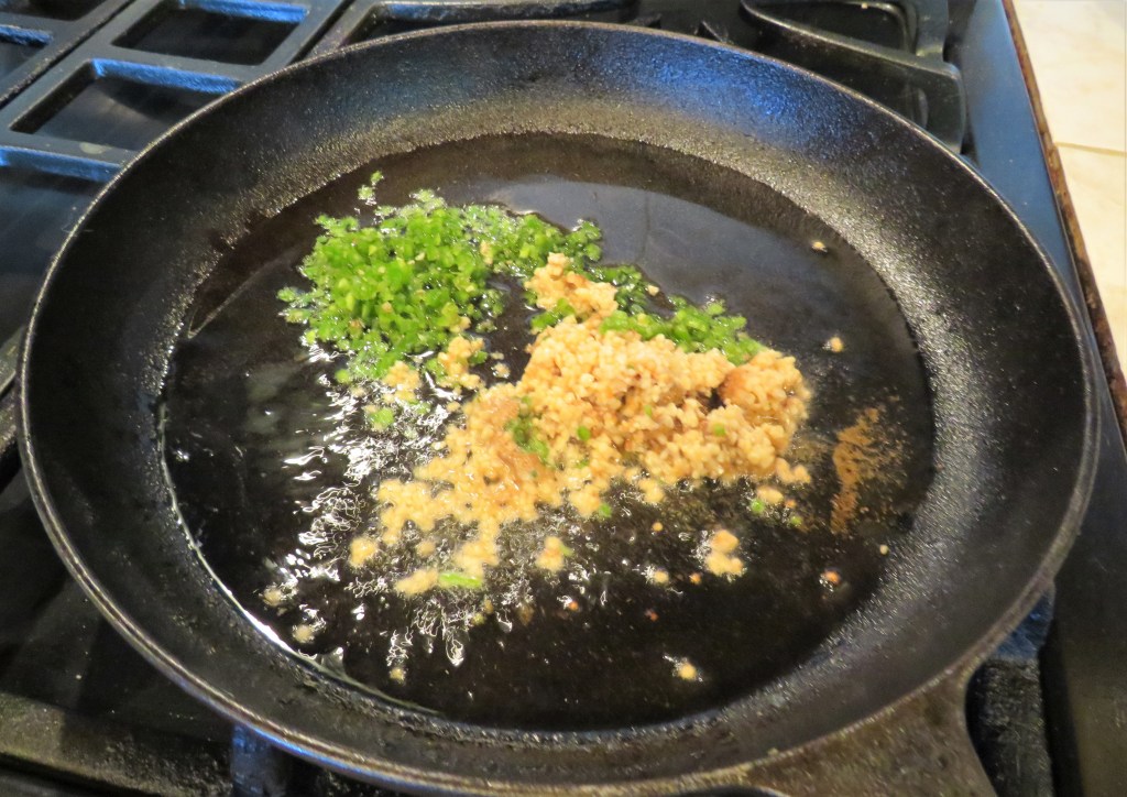 Get a skillet very hot and add the canola oil. Them add the ginger, garlic and chilies and cook for about 2 minutes, or until nice and aromatic.