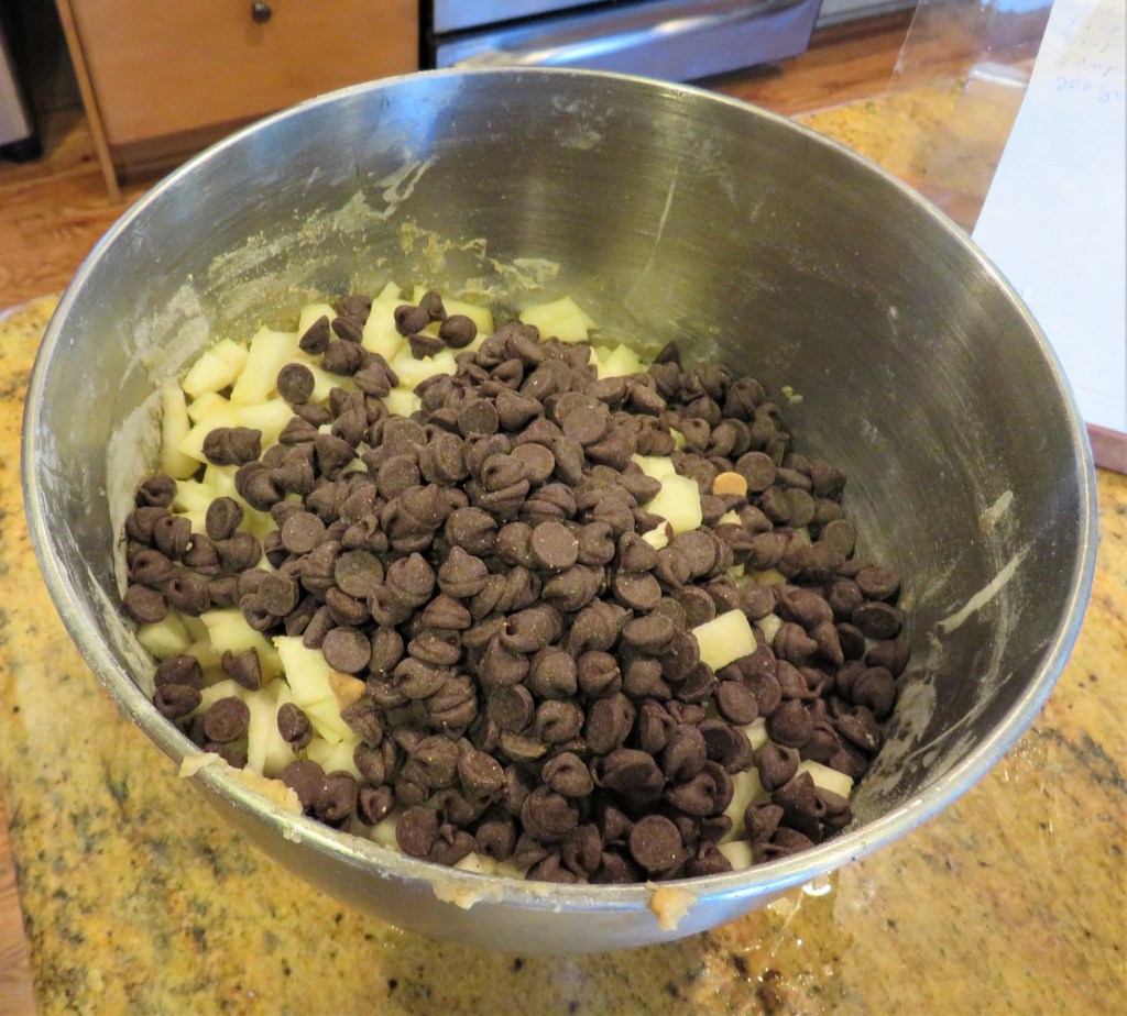 Add the chopped pears and chocolate pieces and fold into the mix.