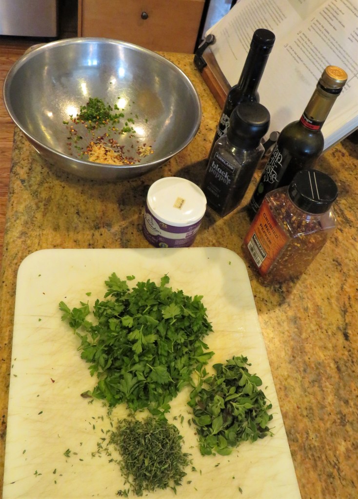 I usually only make my chimichurri sauce with the chopped, NOT pureed, parsley and red pepper flakes, but this time I also used some fresh thyme and fresh oregano, and a small jalapeno as well. It was very tasty indeed. I also like using both a fleur de sel and ground black pepper for this.