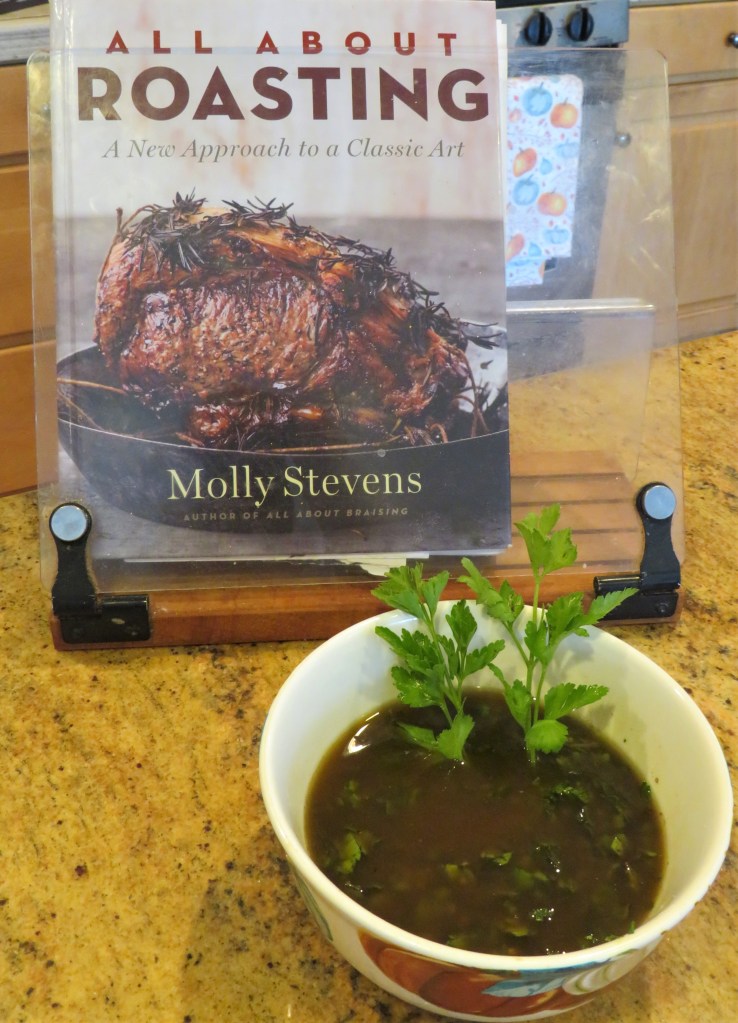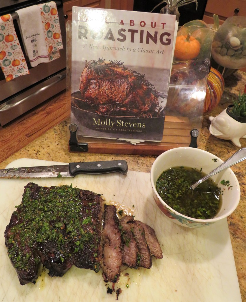 When the meat is completely cooked to your liking, add a very generous amount of the chimichurri sauce on top and Desfruitas! Enjoy! I served our roast with my Brussels sprouts Purple Brussels Sprouts and smashed potatoes Smashed Red Potatoes and warmed ciabiatta on the side with of course, more chimichurri sauce for the bread. Since this was a big, bold roast it needed a big, bold red wine to go with too. I had a big Australian cab to go with the meal this time.