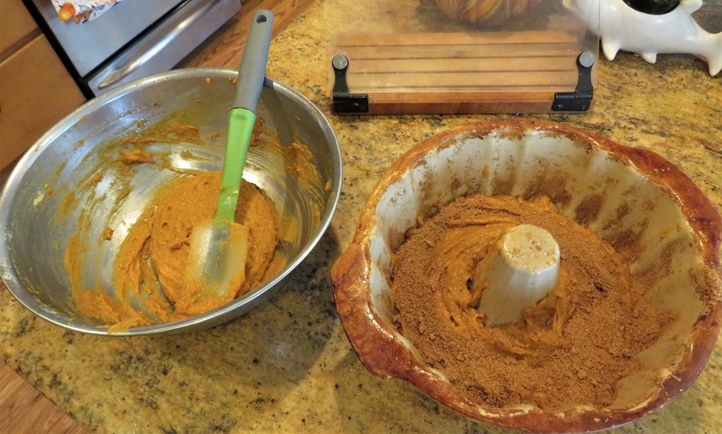 Spray a bundt pan with cooking spray, then firmly pat some of the pumpkin pie swirl around the bottom and sides of the pan as well.