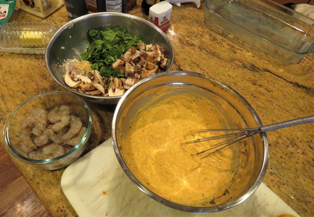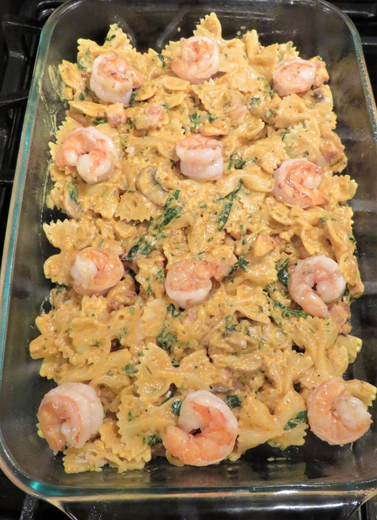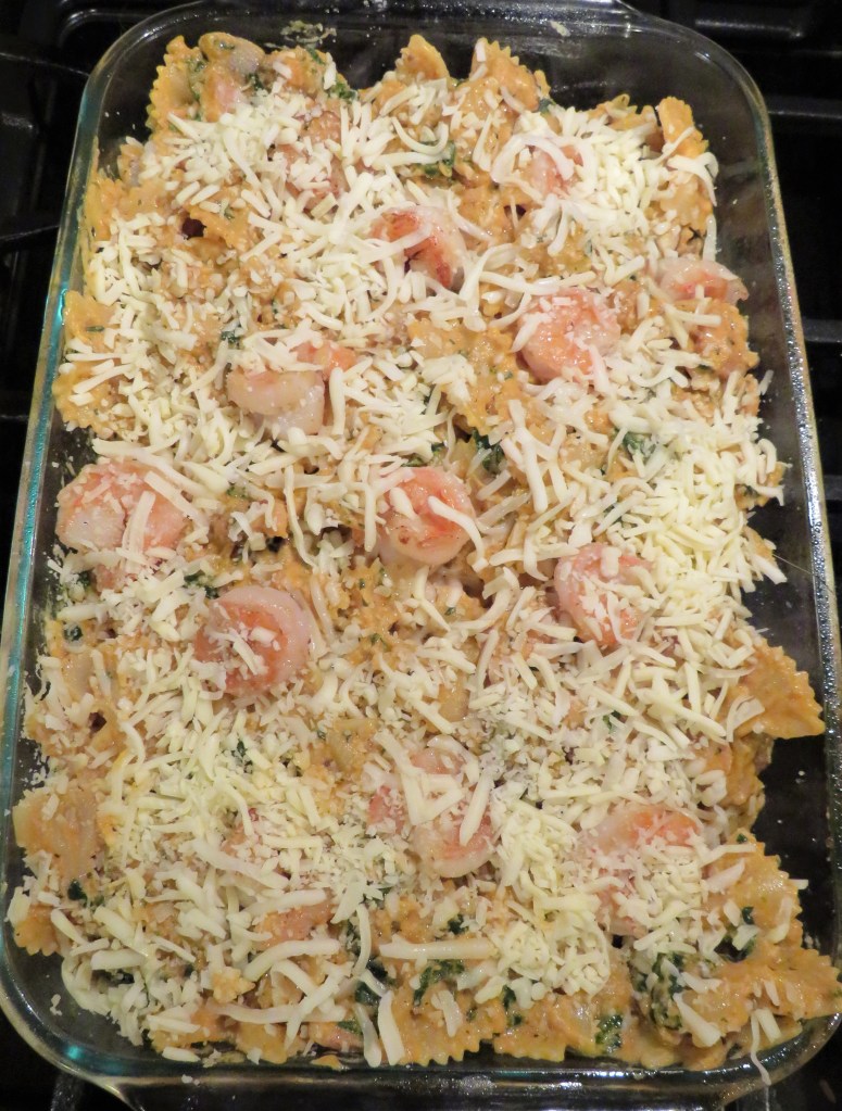 Once everything is mixed together, spoon half of the mixture into the prepared baking pan and add half of the cooked shrimp on top. Repeat until the pan is filled. Add the Mozzarella cheese on top and bake for about 20-30 minutes, or until all the cheese is completely melted.