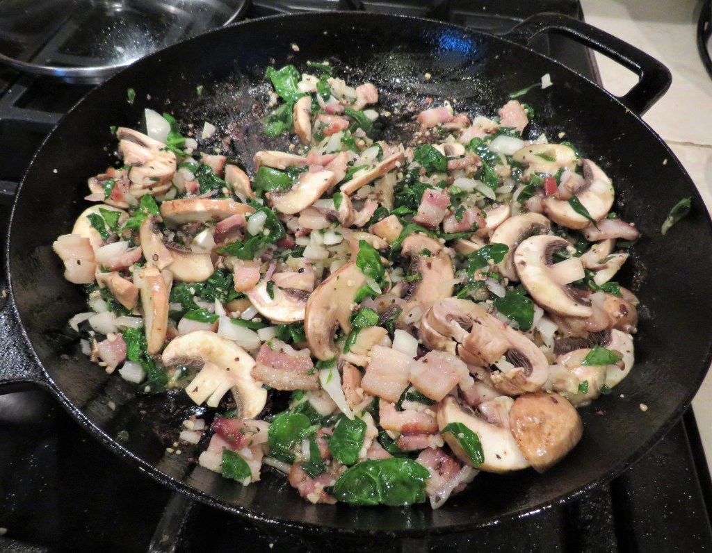 Cook the bacon for about 5-7 minutes, then add the vegetables and continue cooking until everything is cooked.