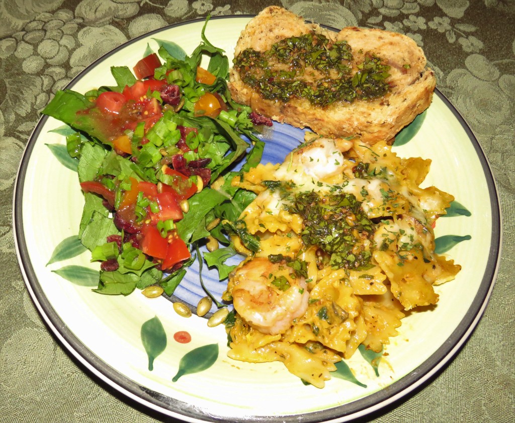 When it is done, spoon it up and serve with your favorite side dishes. I just made a simple salad and used the rest of my cheesy bacon bread Cheesy Onion And BaconΒ Bread that I topped with my chimichurri sauce. Chimichurri Topped Roast I also added a dollop of chimichurri on top of my shrimp bowties too. I had a cool, crisp chardonnay on the side too. Yummy!!!!
