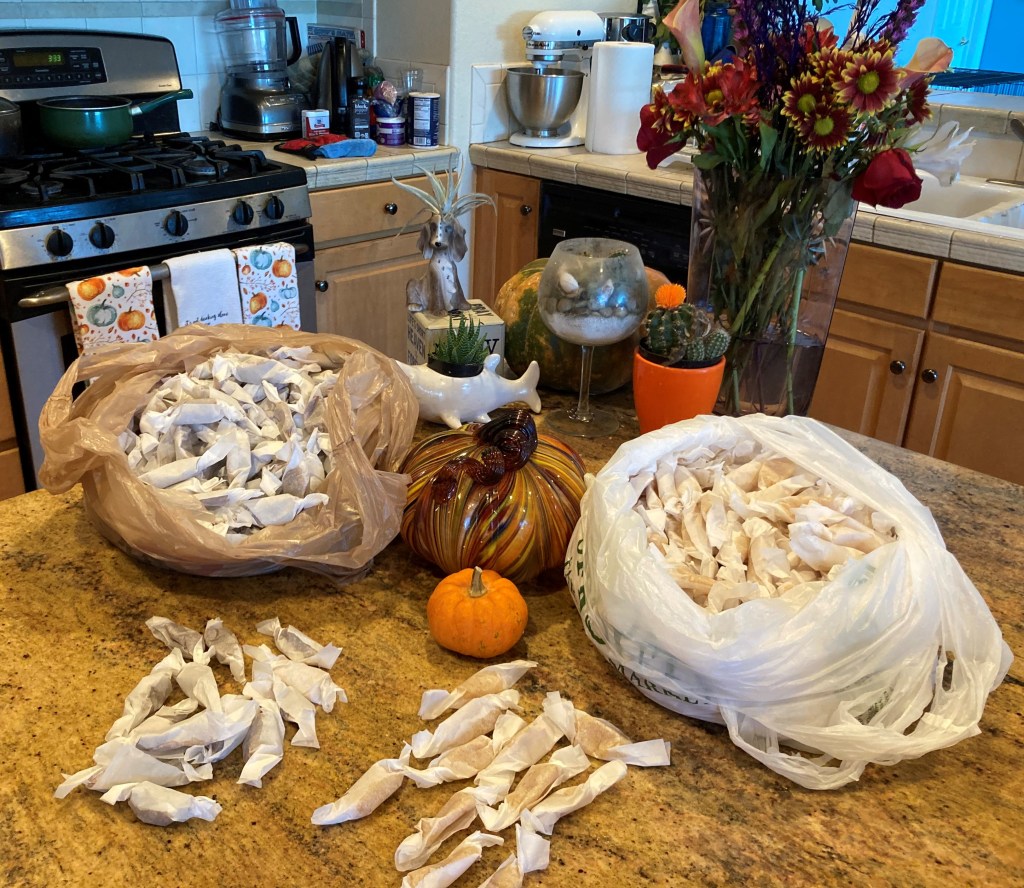 We love getting together to make them and catching up with each other as we are stirring the pots. The part I DON’T like, however, is the cutting and wrapping. It’s not that I don’t like it, but it is just so time consuming, especially since I make two big batches every year. Each batch that I make is 8 lbs of soft, sweet caramel, so that is 16 lbs that have to be cut and wrapped. On average, it takes me 4-5 hours per batch to cut and wrap them all. But they are now done for this year. WHOOOOO HOOOOOOO!!!!!