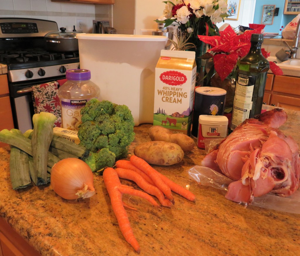 Add the ham, broccoli, stock and seasonings, cover and bring to a boil, then reduce the heat to a simmer and add the cream and the leeks. Continue to cook for an additional 30-40 minutes, stirring often. Adjust the seasonings as needed.