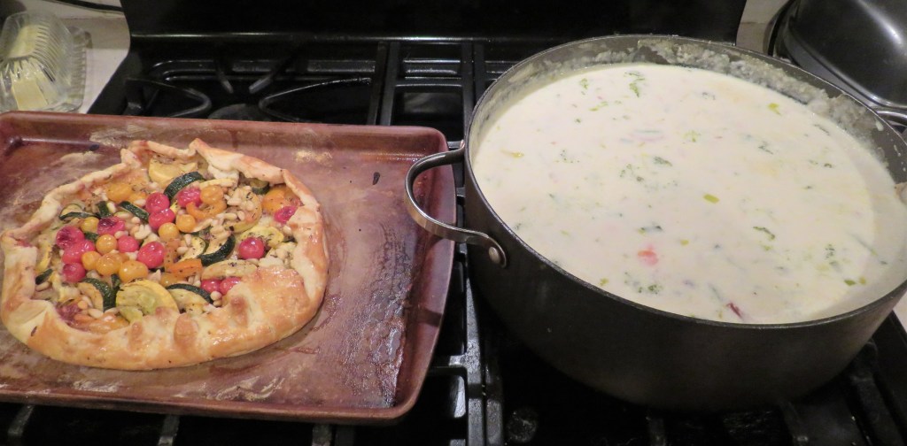 Larry wanted a ham for his birthday dinner, so I cooked a big ham. Well, there are only the two of us, so a big ham goes a long way, and many other things are made with the leftovers. This time, it was a big pot of ham, leek and vegetable chowder. I served it with my roasted vegetable galette and it was perfect for a cold night. Roasted Vegetable Galette