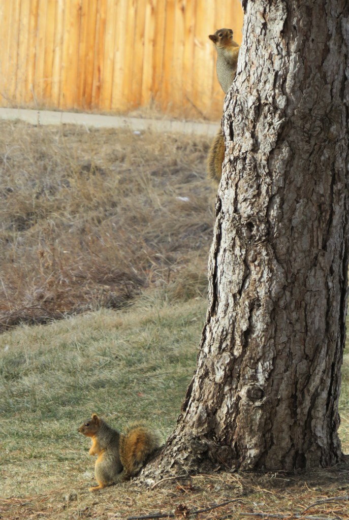 The squirrels are out playin and having fun. the snow and colder weather has eased up just a bit, and they are outside taking advantage of the slightly warmer weather.