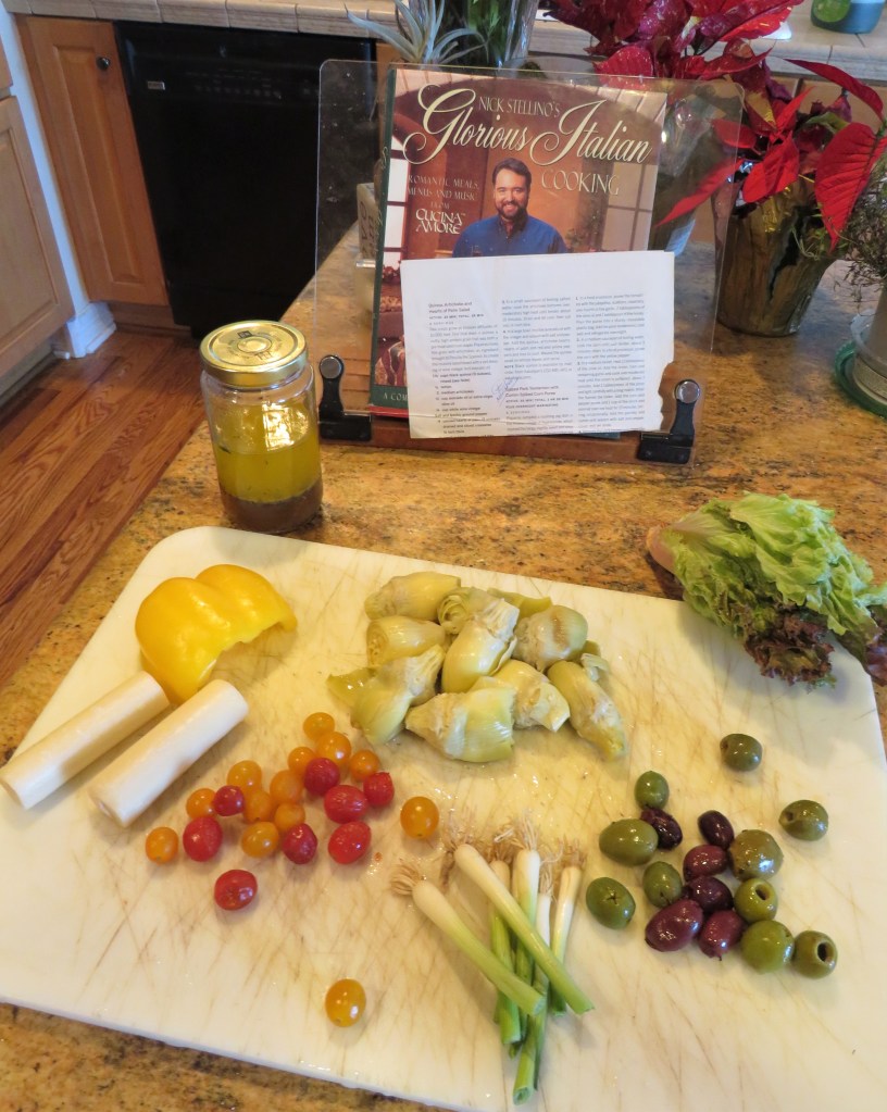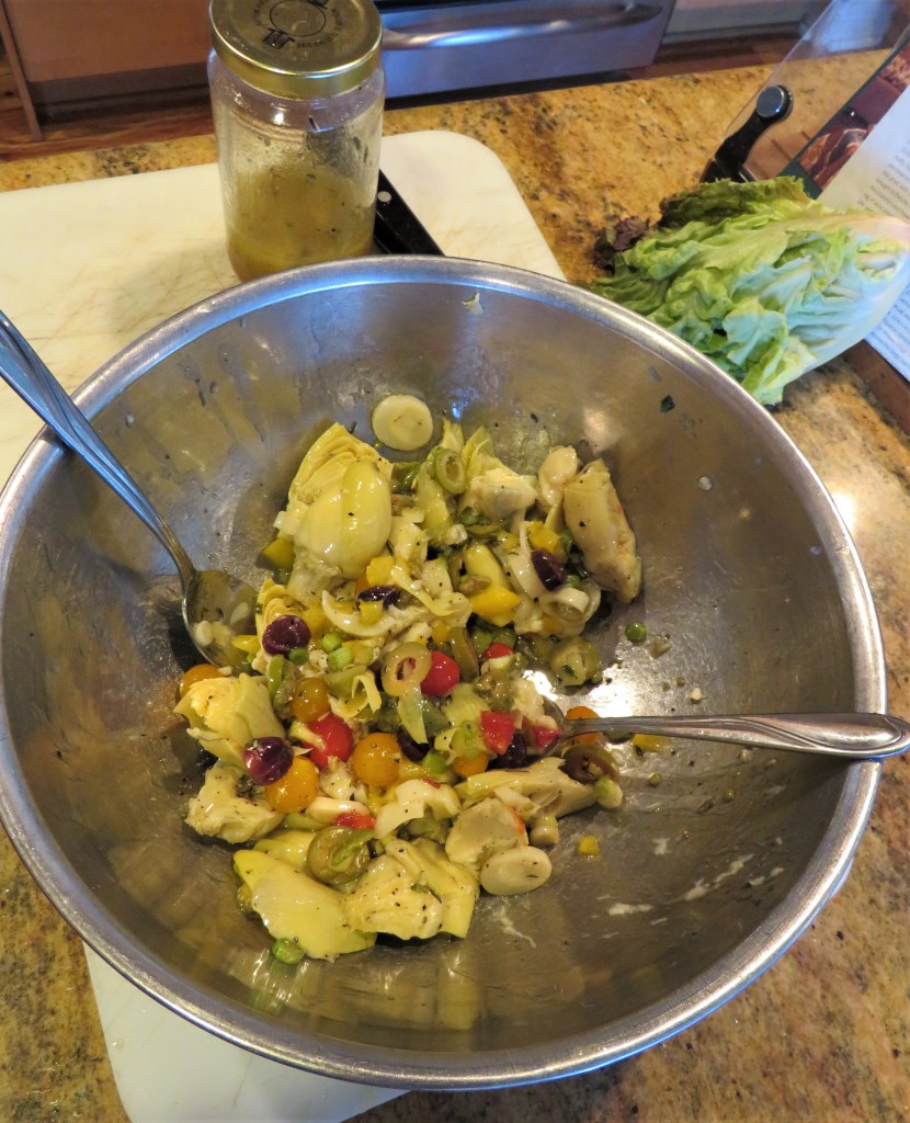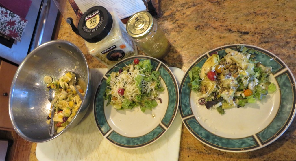 Gently toss everything, except the lettuce and the toppings, together in the lemon vinaigrette then serve atop a bed of chopped lettuce. Top with the Parmagiano cheese and/or the pepita seeds and enjoy. Mine has the pepita seeds and Larry’s has the cheese.