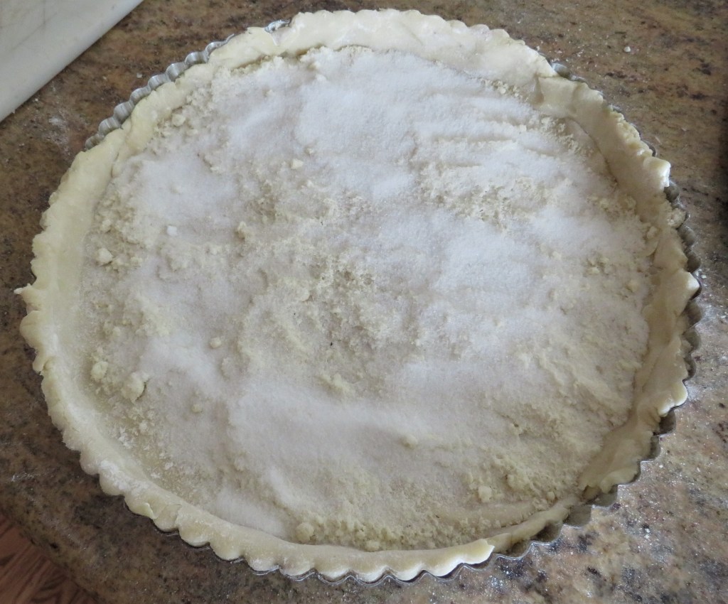 Roll out the dough on a lightly floured surface and press firmly into a fluted tart pan. Sprinkle the almond flour and sugar around the bottom of the dough.