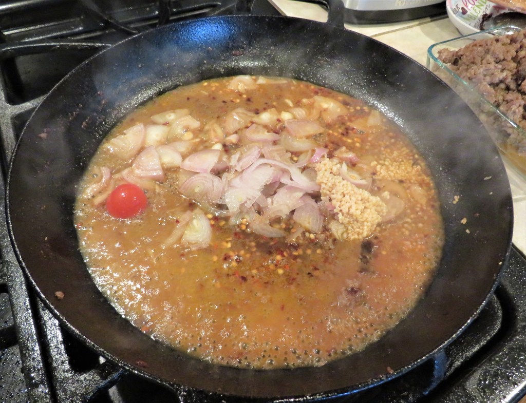 Then deglaze the pan with the white wine, shallots, garlic and red pepper flakes.