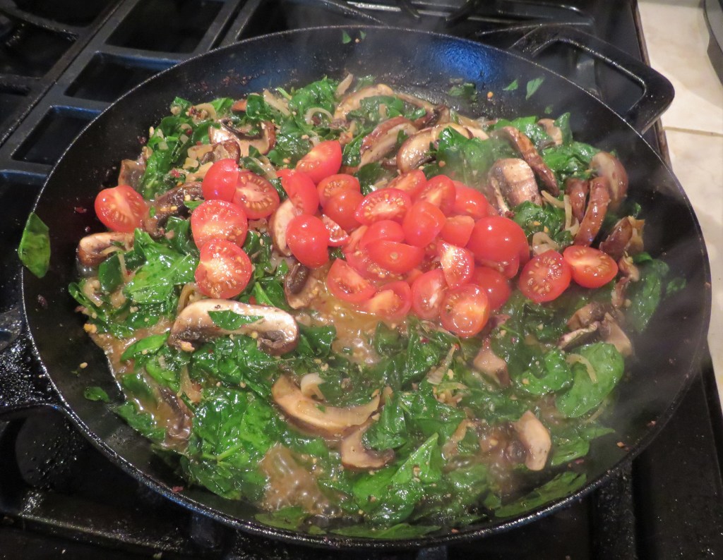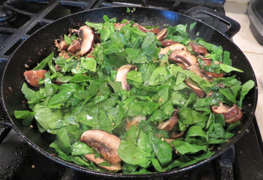 Add the spinach and mushrooms. Mix everything together and allow to cook for about 5-7 minutes, stirring constantly, to cook the spinach and mushrooms.