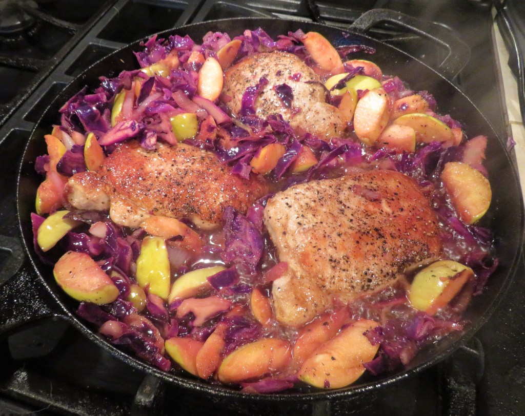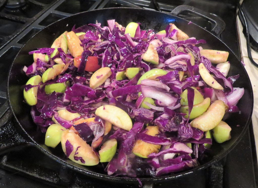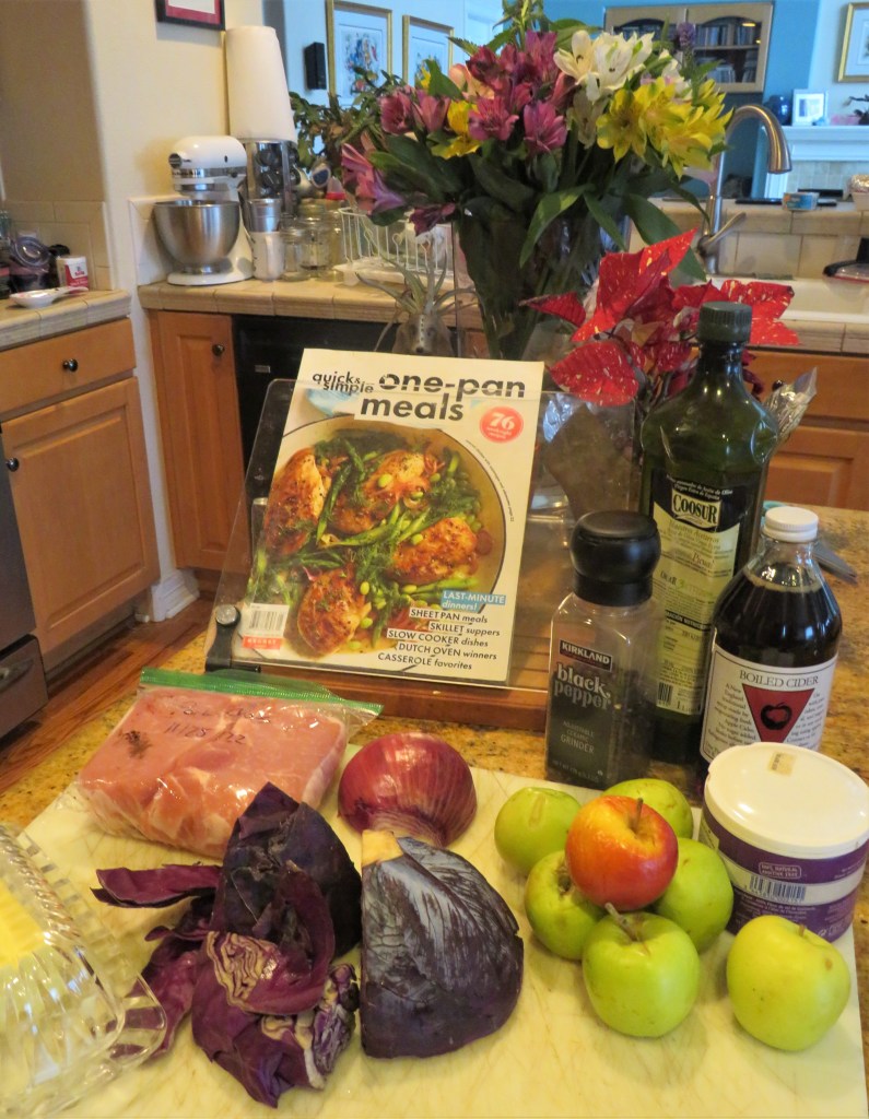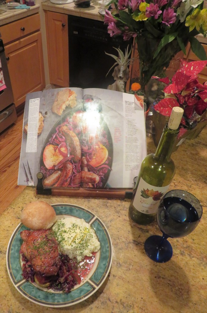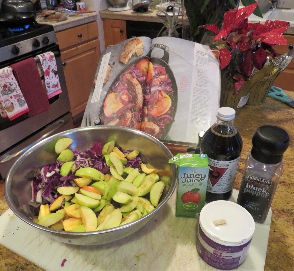 Larry is of German ancestry, so every now and then I prepare traditional German foods for us. Unlike most of us, Larry’s background is 100% German. Me, on the other hand, I am am 100% American mutt, with my background coming from all over Northern Europe, which eventually landed in Australia (my dad). Variations of pork with apples and red cabbage are in all of my German cookbooks, and I have made many of them. They are all delicious with only subtle differences.