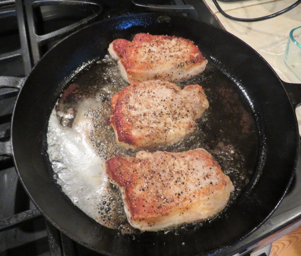 Pat dry the pork chops with a paper towel and season with salt and pepper on both sides. Sear the pork on all sides, about 2-3 minutes per side depending on thickness, until you have a golden crust all around. Once the pork is completely seared, remove it from the skillet and set aside.
