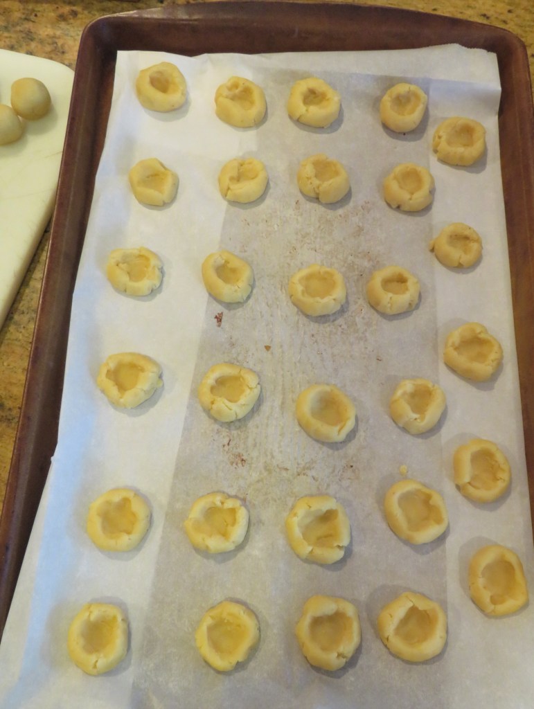 Place the dough onto a baking sheet lined with parchment paper. With the end of a wooden spoon, punch a small hole into the center of each ball and press it lightly with your fingers to enlarge the hole. Place back in the refrigerator for about 15 minutes to set.